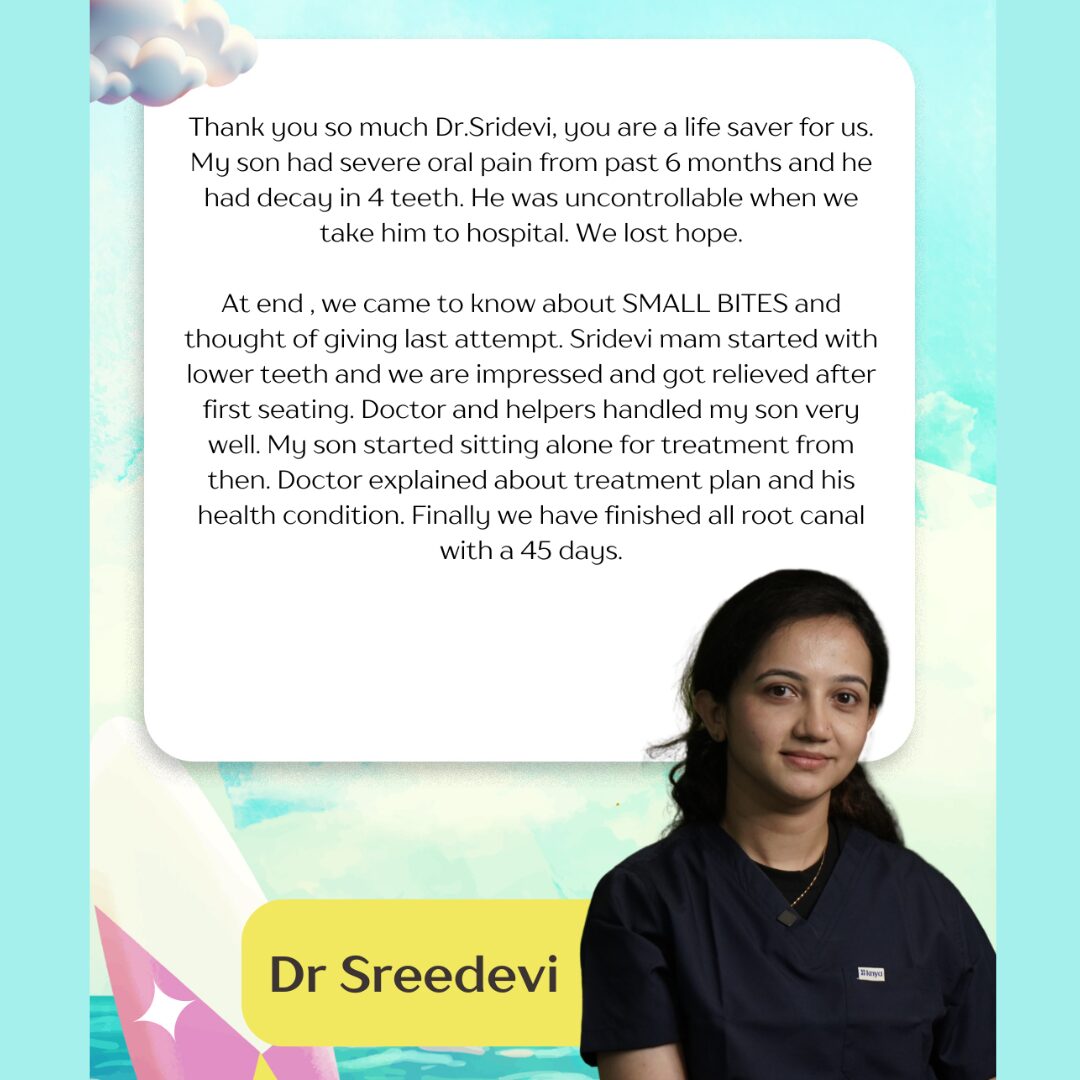 Founded by Dr. Premila Naidu in 2007, Small Bites has over the last 17+ years constantly strived to be different, whether in our dental expertise & technological intervention or care and warmth backed by experience and expertise. We cater to the special needs of children with developmental disabilities such as Autism, Aspergers, Downs Syndrome, providing one-on-one care & attention to ensure the best level of dental care at all times.